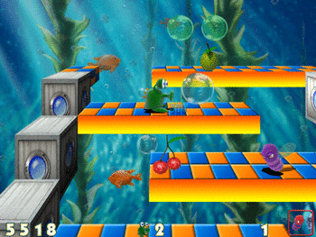 Introducing Bubbly. Hes cute. Hes wet. He has a cold. Which would explain the bubbles coming out of his nose. Bubbly must navigate his way through many challenging oceans to reach his goal. Watch out! Many enemies will try to stop Bubbly. He must contest with nasty robots, killer bees, and strange springy things. Luckily, Bubbly has a sinus condition which will help him to blow bubbles and stop his foes cold in their watery tracks.