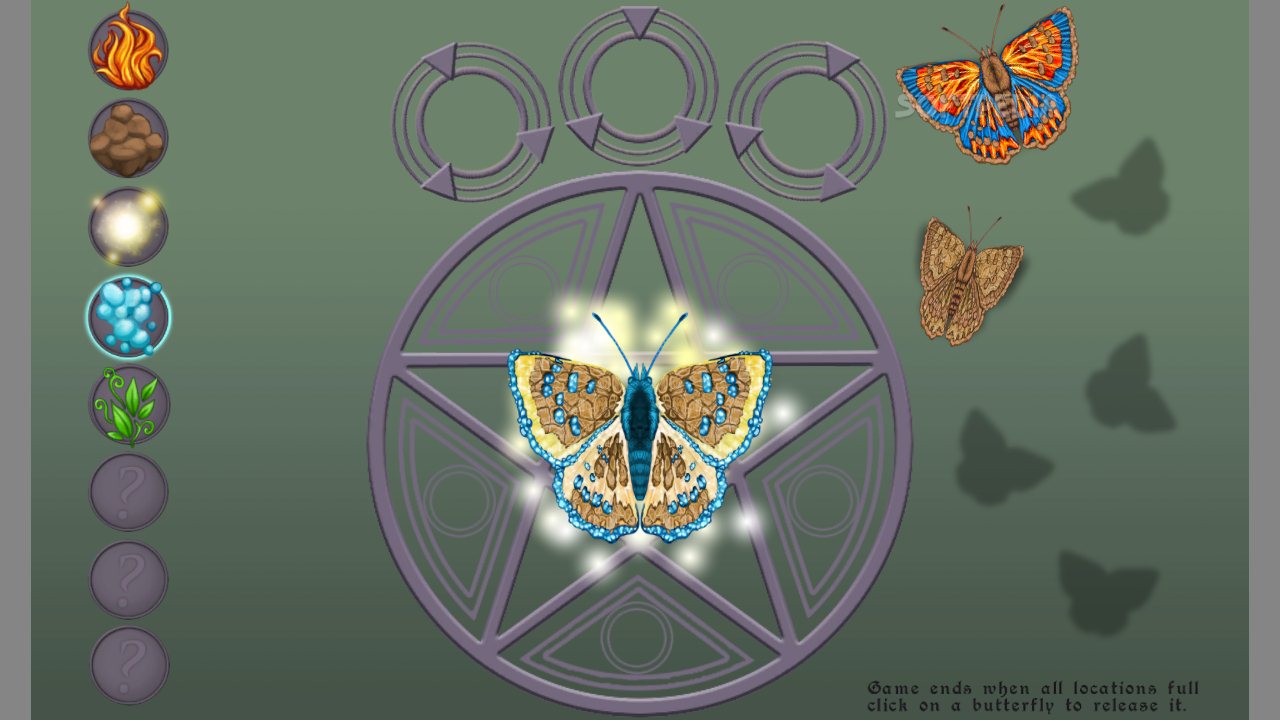 After the elements are chosen, the butterfly can be brought to life by following the pattern of five blinking symbols. The computer goes first, and you have to reproduce them in order to complete the ritual. Each butterfly is then placed in a slot, where it remains until the game ends or you decide to let it go. Thanks to this, you can prevent the game from ending for as long as you wish.