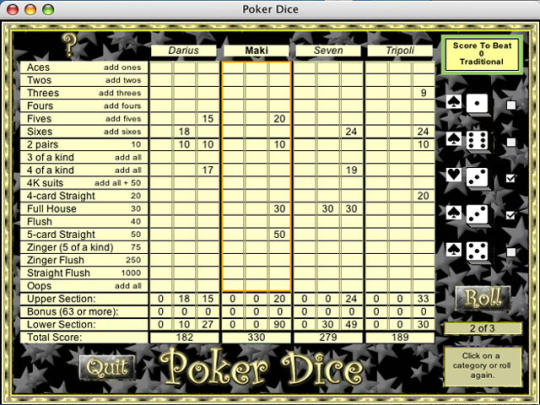 A cross between poker and the traditional 5-dice games with several variations to play. Traditional, Down the Line, Wild Cards, Roll for Par, Face Off, Acey Deucey, Hearts, and Lots of Zingers. Down the Line is the toughest nut to crack, as you must score each category in order, Aces, then Twos, then Threes, right down the line. Wild Cards includes wild cards if you are lucky enough to get one (or more); you set the number and suit. Each roll offers new chances at more wild cards. Lots of Zingers allows you to score Zingers over and over again in the same game, each additional Zinger giving you a free extra turn, even in multiplayer games. This version is a first release on Softpaz Download.com.