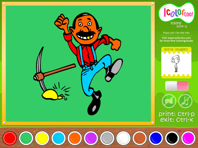 IColorToo coloring books are exciting coloring software for children. The books are parents-friendly as well as software spreads over the whole screen and exits on certain double-key shortcut combination only so there is next to nothing chance that a child will jump into operating system and ask a parent for assistance. All images are exclusive for IColorToo books. IColorToo: Toons 11 book contains 25 images.