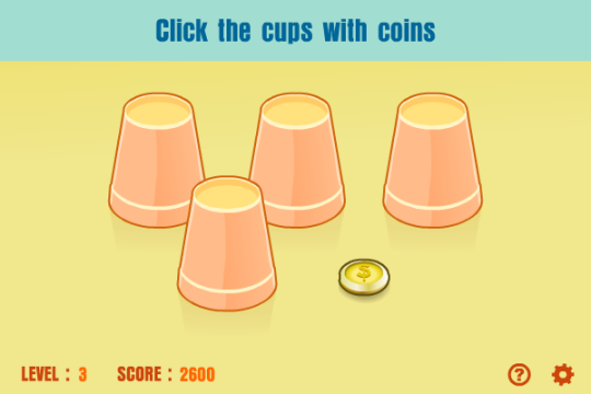 Beware of the tricky movements of the cups! In this game, your goal is to select the cups which contain coins after the positions of the cups are shifted. At the start of each level, the positions of the coins will be displayed for a few seconds. The golds will then be covered by paper cups, and the cups will start to move. Then you need to click the correct cups which contain coins in order to proceed. Remember to watch the movements of the cups carefully, as sometimes tricky shifts may occur, for example, only the positions of the cups are shifted but the coins are not moved. As you advance in the game, the number of coins will increase and the movements of the cups will become more complicated. Look through the disguises to reveal all of the golds!