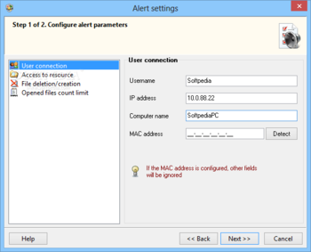 Audit User Access, Monitor Changes in Shared Files and Folders, and Generate Alerts. Configure alerts and receive the screen, sound, and e-mail notifications on connections to a certain shared folder or file. Different types of alerts are supported. Be notified when a connection to a shared folder occurs by a certain user, from a certain computer, or from a computer with certain IP or MAC address.