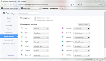 It goes without saying that 360 Browser includes other functions present in the well-known browsers, such as bookmark and download managers or mouse gestures support.
