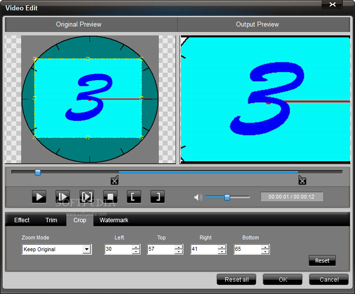 Crop off the black edges of video, setting the screen aspect ratio by keep original/ full screen/16:9/4:3.