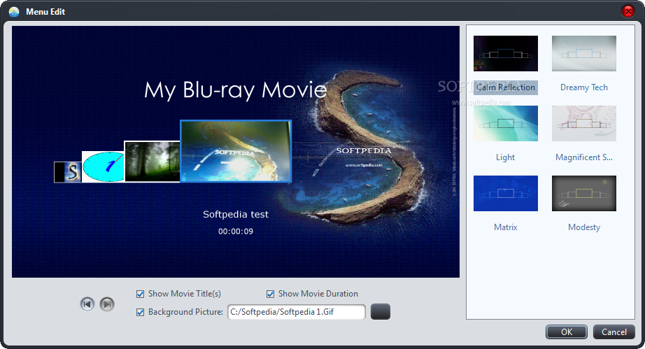 Build stylish Blu-ray discs by adding background picture, edit title of the movie. You can also hide the display of movie title and duration time to your preference.
