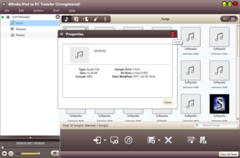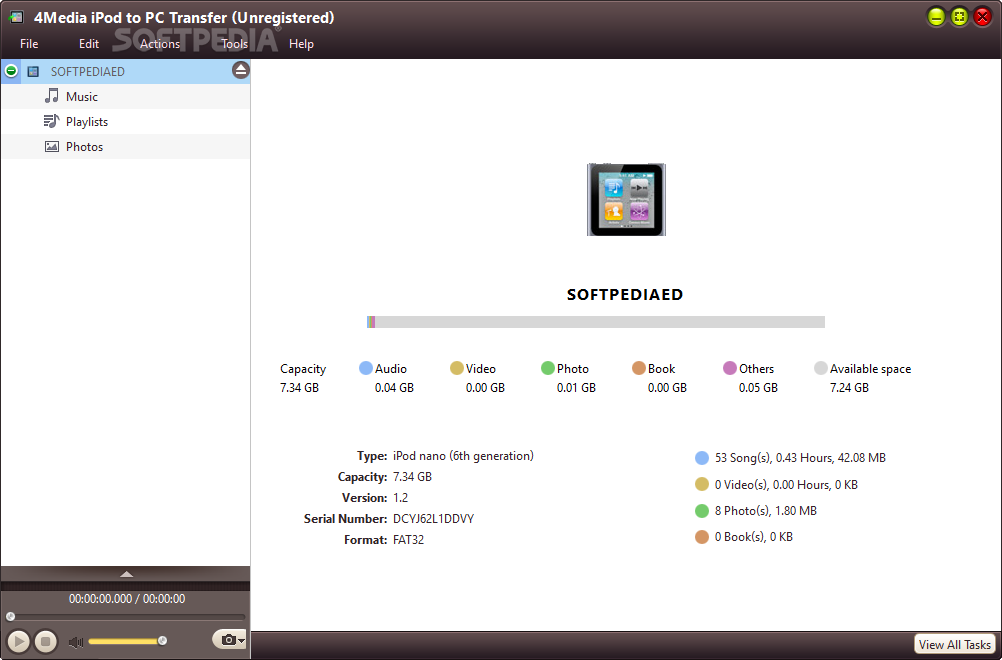 4Media iPod to PC Transfer can automatically detect an iPod when it is connected to the PC, and provides you with info on the device as soon as that happens, including details on the amount of storage space used, and the type of files present on it.