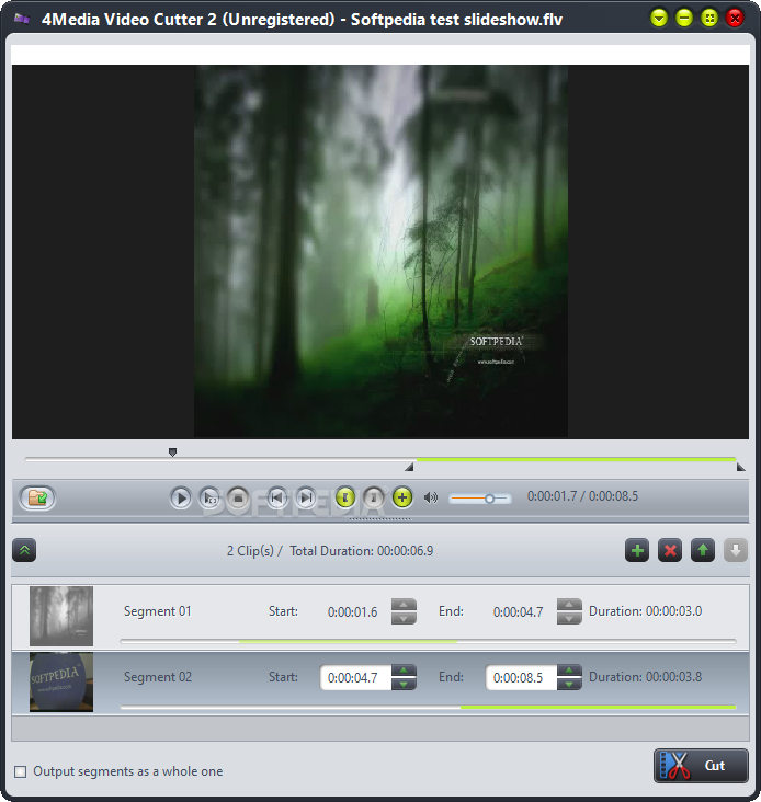 Output the segments respectively after clipping. 4Media Video Cutter 2 also offers the option to output all segments as a whole one to create a new video file.
