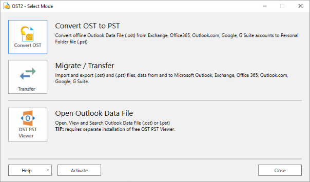Free OST to PST Converter. Convert OST to PST, even if files are inaccessible. OST2 Free Edition can convert up to 5 items in each folder of orphaned OST file. Also, with Free OST2 it is possible to scan for .OST files which are connected to Microsoft Outlook. Using OST2, you can import and export OST and PST files, data from and to Microsoft Outlook, Exchange, Office 365, Outlook.com, Google and G Suite. You will be able to choose a specific OST or PST file or you can scan your computer and OST2 will find all OST and PST files. The Free OST2 version allows you to transfer up to 5 items from each folder. Using Enterprise Edition convert and trasfer all OST files which are linked or unlinked to Microsoft Outlook. Use OST2 to transfer data from Exchange to Microsoft Outlook, make your Exchange account emails, calendar, contacts and other items accessible through Outlook. To prevent Offline Storage .ost files data loss, back up data as a PST file. In case of the Exchange Server crash, downtime or accidental user account deletion, you will be able to recover Exchange mailbox folders by opening the converted PST file in Outlook. Convert files in a couple of clicks - select an OST file and choose the location where you want to save the PST file.