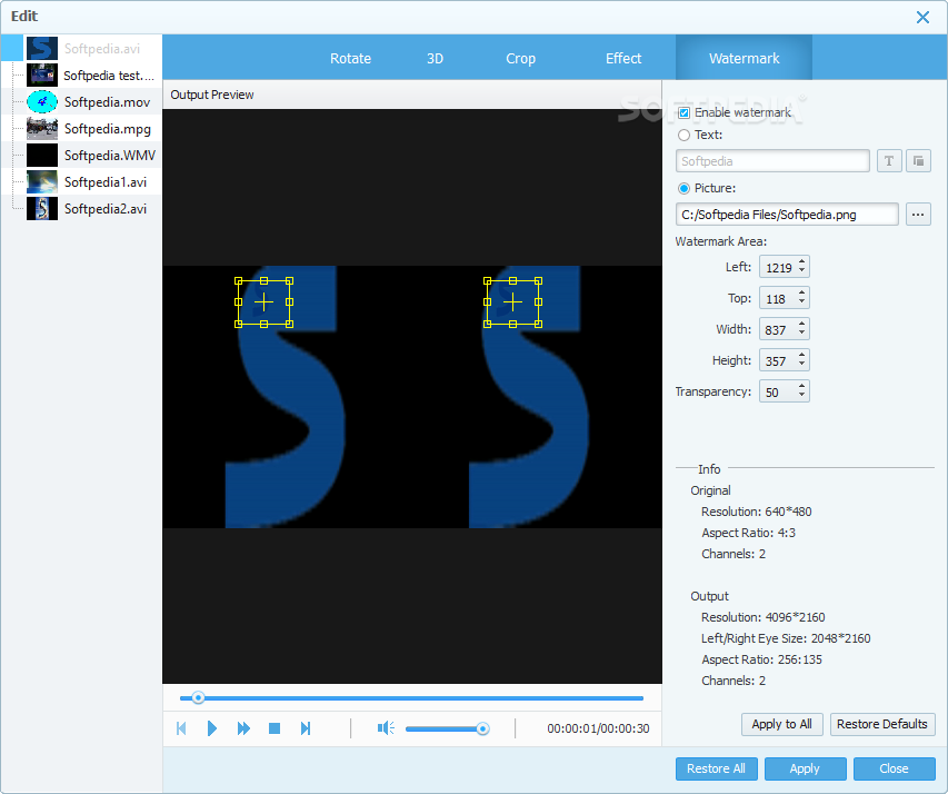 Once you have imported your files, you can trim various sections from each video, rotate and crop them, as well as insert visual effects or watermarks. Additionally, you have the option of converting your videos to 3D.