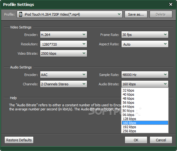 All the parameters of profile can be provided for you to choose the exact settings for your iPod. (Encoder, Frame Rate, Resolution, Bitrate, Sample Rate, etc).