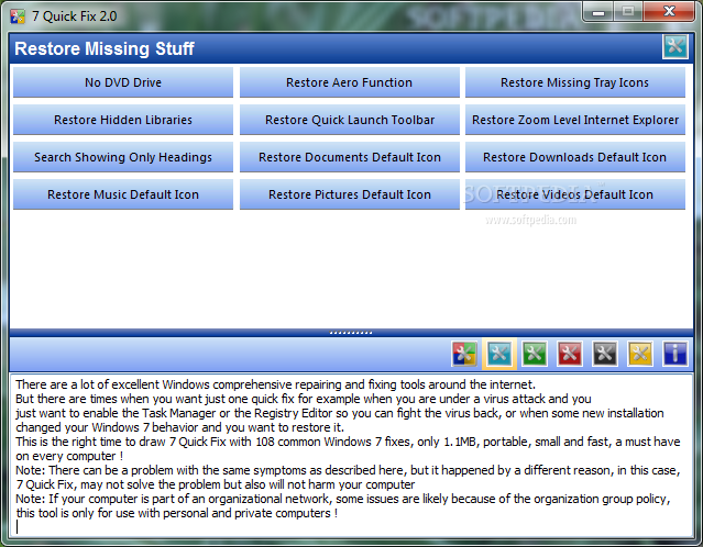 You can download 7 Quick Fix which is 1.54 MB in size and belongs to the software category System Tweak. 7 Quick Fix was released on 2012-03-02 and last updated on our database on 2017-03-04 and is currently at version 2.
