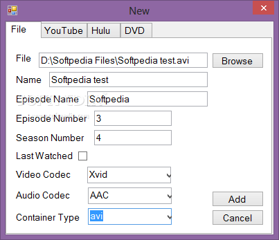 What’s more, each group can be customized by uploading a video file from the computer (e.g. FLV, AVI, MKV, OGM, MP4, WMV, MPEG), providing details about the name of the clip, episode name and number, season number, and selecting the video and audio codec.
