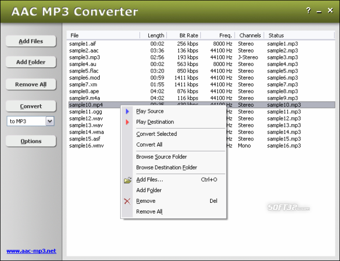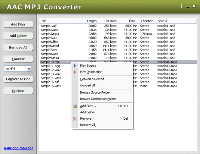 AAC MP3 Converter converts AAC to MP3 and MP3 to AAC. It is an ALL IN ONE audio converter that supports more than 90 audio and video files, and keeps ID3 tag when converting. The software is full compatible with Vista.