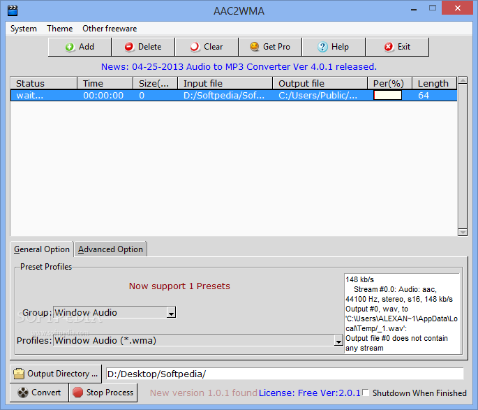 You can download AAC2WMA which is 6.25 MB in size and belongs to the software category Audio. AAC2WMA was released on 2013-08-02 and last updated on our database on 2017-03-10 and is currently at version 2.