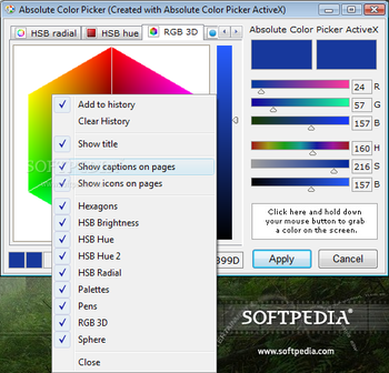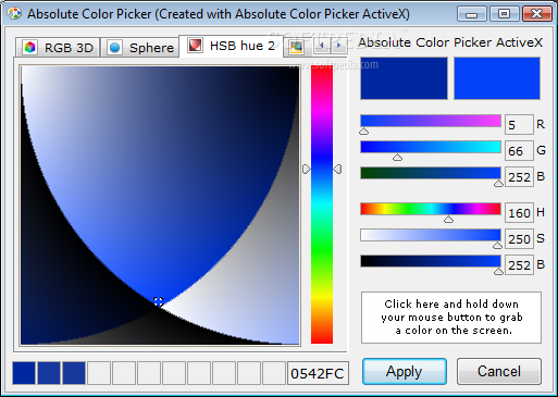 Apart of conventional, built-in color picker dialog features, Absolute Color Picker offers a number of unique extensions, such as extended color models (HSB Brightness, HSB Radial, HSB Hue, RGB 3D Sphere, HSB Hue2, HSB Pens, HSB Hexagons and HSB Palettes).