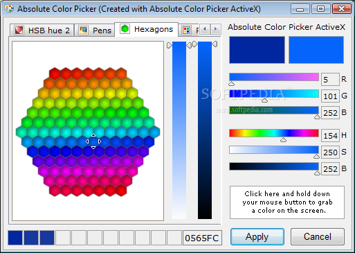 Absolute Color Picker has simple and intuitive interface allowing any level users to master it at zero-time and with a great excitementSystem requirementsPentium II class at least 300 MHz