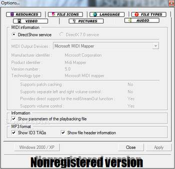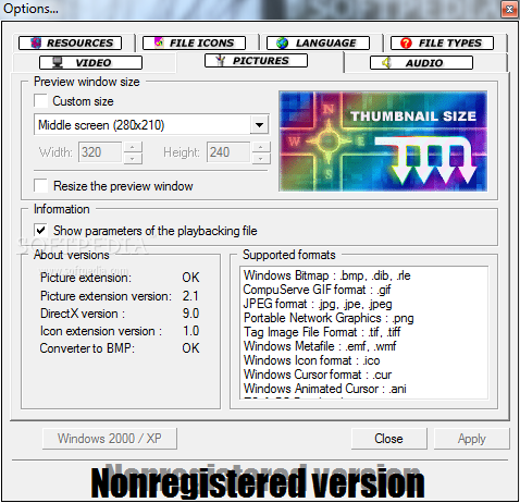 As for ‘Pictures’, you can also set the preview window dimensions being able to show the parameters of the played file. In the ‘Audio’ tab, you can choose to ‘Show ID3 TAGs’ or the ‘File Header Information’.System requirementsDirectX 7.0 or later