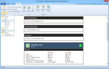While you work, Active Takeoff can automatically generate a report that reflects your project: the name, description, contact details and a list of measurement tools used. The report is automatically updated when you save the current project and can be printed or exported to Excel, XML or HTML formats. All in all, Active Takeoff is reliable, easy to use and capable of saving you time by automatically generating reports.
