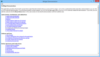 The “Tk Widget Demonstration" utility provides people with multiple scripts that are meant at demonstrating the capabilities of Tk widgets. When selecting a preferred demonstration module, one can view its corresponding code and browse through it using the provided console.