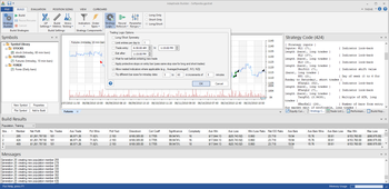 The next two steps involve building the actual strategy, a task that is entirely automated, and generating strategy codes – which are dumped into a text box once analyses are completed. To build strategies, the application tests hundreds and even thousands of scenarios – a task that can take considerable time, using genetic programming technology.