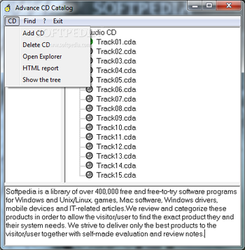 This is useful if you want to keep track of a vast CD collection. With CD Catalog Expert, you can save the drive to a text format - and later browse or search.Limitations in the unregistered version30 uses trial