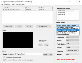 In addition, you can preview tracks in a built-in audio player, delete an entry from the file list or clear the entire queue, as well as set Agree MP3 to M4A AAC Converter to turn off the computer automatically or to open the output directory after encoding.