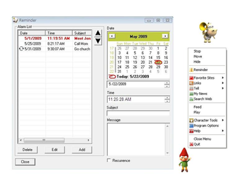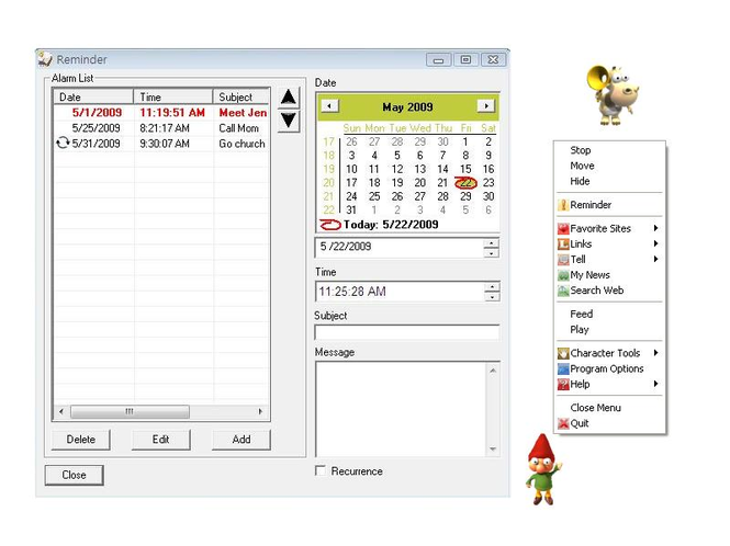 A.I. Talking reminder is easy and fun to use. It can help you keep track of important events, time, and date while you are working on your computer. At program startup, A.I. Talking Reminder will check for past due reminder items in the reminder list. It will bring out the reminder list when there are past due reminders. Also, when a reminder item is due, the character on screen will read your reminder message to you with current time and date, moreover, a reminder message will gradually rise from the bottom of screen in case you are away from the computer. On the reminder message, there are options to snooze, edit, or simply click "OK" to confirm and remove the reminder from list.