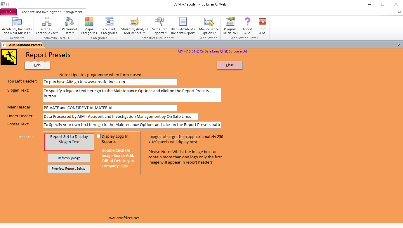 AIM - Accident and Investigation Management is a demo software by On Safe Lines QHSE Software Ltd and works on Windows 10, Windows 8.1, Windows 8, Windows 7, Windows XP, Windows 2000, Windows 2003, Windows 2008, Windows Vista, Windows 2012.