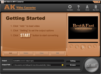 AK Video to MP4 Converter is a powerful video converter which can convert all popular video formats, such as MPG, MPEG, MPEG-4, AVI, 3GP, 3GPP(3G2), FLV, SWF, RM, WMV, H.264/AVC, AVCHD, DivX, XviD, VOB, M4V, ASF to MP4 file, etc. Convert video with HD video conversion supported. Customize the output size, video quality, and parameters for output media files at will.