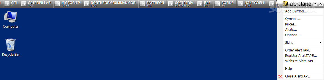 AlertTAPE is a useful tool for stock market enthusiasts, which is displayed as a dynamic bar, at the top of the screen. The program shows a series of live stock quotes while allowing you to work without covering necessary windows. You can customize the bar, by adding or removing stock services.