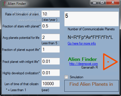Alien Finder is a lightweight and portable application designed to help you calculate the number of highly developed and communicable civilizations in our galaxy.