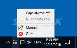 AlomWare Lights can help you avoid accidentally typing lower or upper case letters, or try to type numbers with the Num Lock activated. Moreover, for your convenience, you can keep CapsLock always turned off as well as NumLock always turned on from the right-click menu of this tool (just click their entries to make the tick appear).
