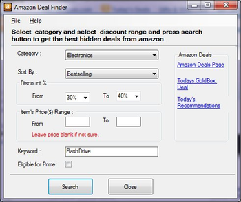 Amazon Deals finder is an Advance search engine for amazon that helps in finding the best deals or discount on Amazon and makes most from your hard earns money. Application makes use of some of the amazon hacks and directs you to amazon web site itself.