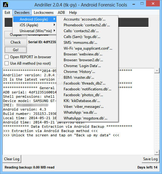 You can download Andriller which is 9.18 MB in size and belongs to the software category Mobile Phone Tools. Andriller was released on 2017-02-20 and last updated on our database on 2017-04-23 and is currently at version 2.6.