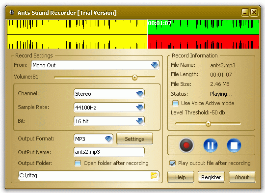 You can download Ants Sound Recorder which is 2.28 MB in size and belongs to the software category Audio Editors Convertors Mixers. Ants Sound Recorder was released on 2010-04-13 and last updated on our database on 2017-02-16 and is currently at version 1.