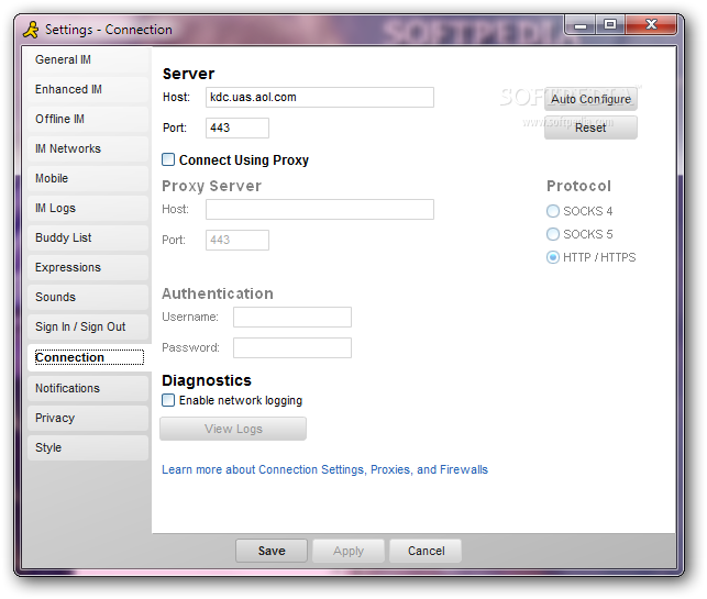 Connection settings: Having issues signing on? AIM can help you configure your firewall or proxy settings. Look for the Connection tab in your settings manager.