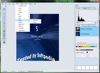 The application also comes with a wide range of effects, and filters. Basic color management helps adjust RGB sliders, with more advanced options to sharpen, blur, brighten, skew, emboss, edge-detect, and a couple of special effects like pixelate, and time warp.