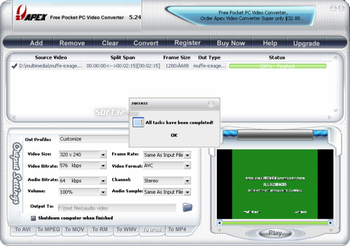Apex Free Pocket PC Video Converter is designed to meet all your needs of convert any popular video to Pocket PC Extremely fast conversion speed and friendly user interface let you convert video files between many formats with ease. The powerful features and It's free make Apex Free Pocket PC Video Converter an affordable and powerful video conversion solution on personal computer.