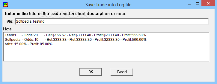 What’s more, you can tweak the odds or let the application give the best return for you, optimize and maximize bets to the nearest $1, $5, or $10, enter the commission value for the betting exchange, optimize the bet for one value while keeping the other constant, maximize the return on one leg, and save your trade in the log file by entering a title and providing details about the trade and additional notes.