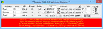 You are allowed to add the odds in three formats, namely American, European or British, enter an investment amount that is used for calculating the bets on different legs (bookmakers), and optimize the dollar amount to give a maximum return. The arbitrage values are shown in different formats regardless of the entry format.