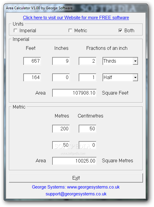 Area Calculator is a free software by Georgesystems and works on Windows 10, Windows 8.1, Windows 8, Windows 7, Windows 2012.