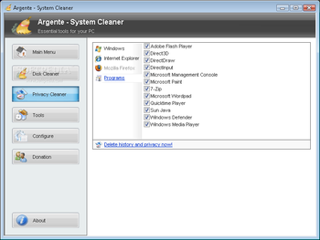 The "Privacy Cleaner" takes care of temporary files, search autocomplete, recent documents, screensaver history, clipboard, Recycle Bin, Windows log files, read emails, and others found in web browsers, programs and system files.