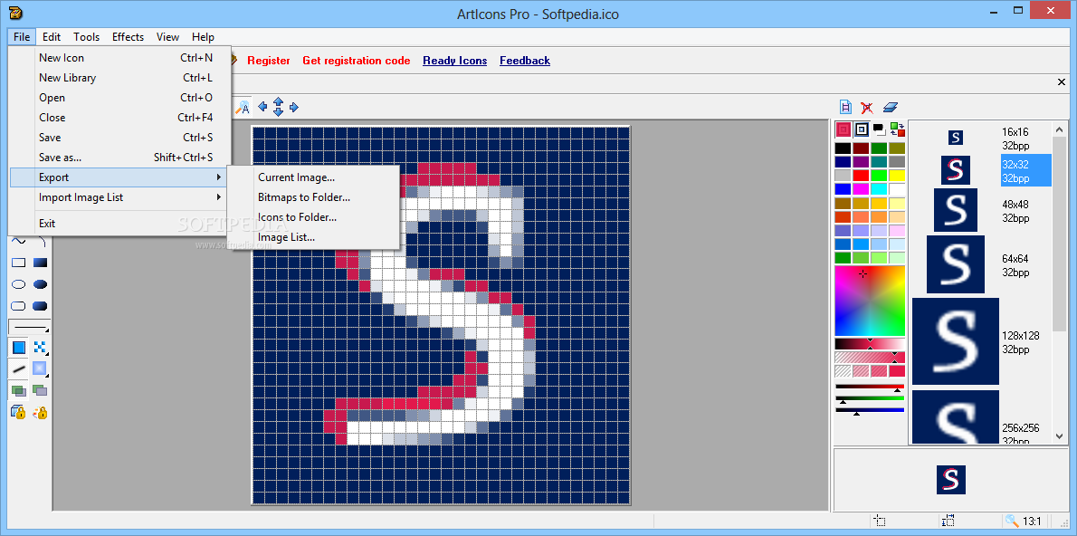 Create and edit icons in either standard or custom sizes, in color depths up to 16 million colors