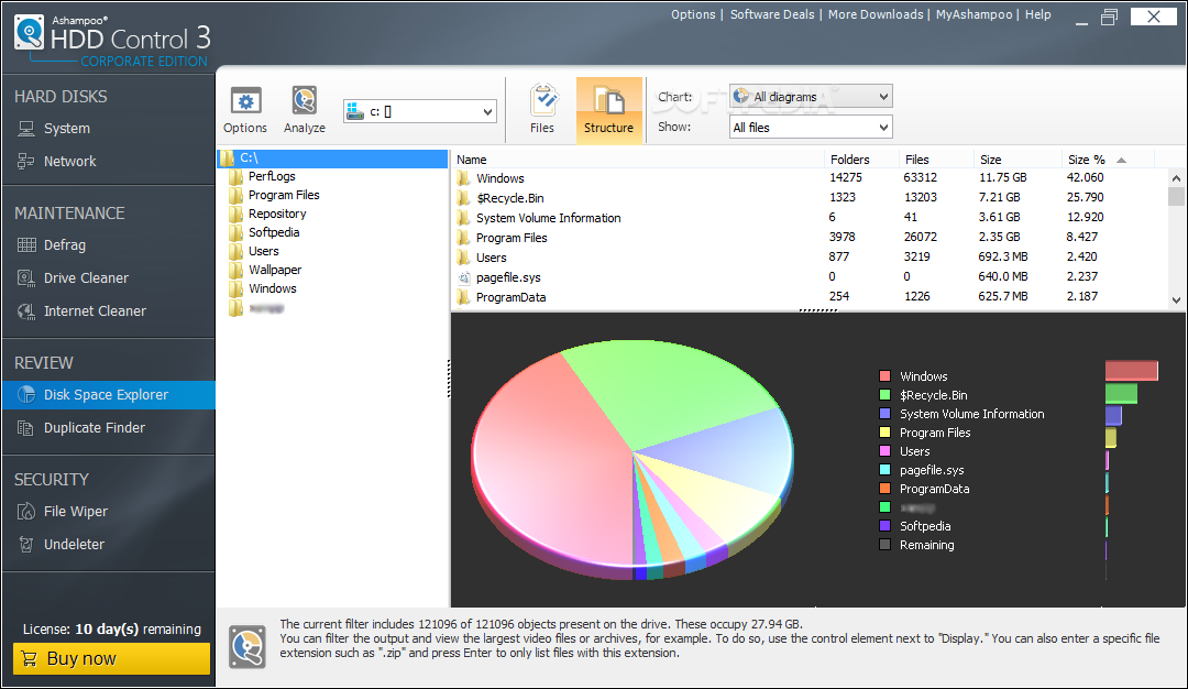 Ashampoo HDD Control Corporate Edition can generate the folder size structure for each of the selected drives and display it as a pie chart. It can identify file duplicates for any type of documents and it can easily manage file recovery. The Undeleter can detect damaged or erased files and help you recover the ones you select.