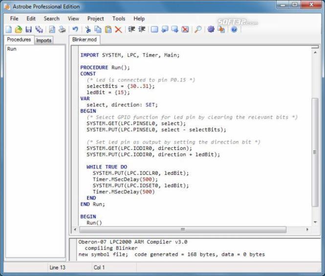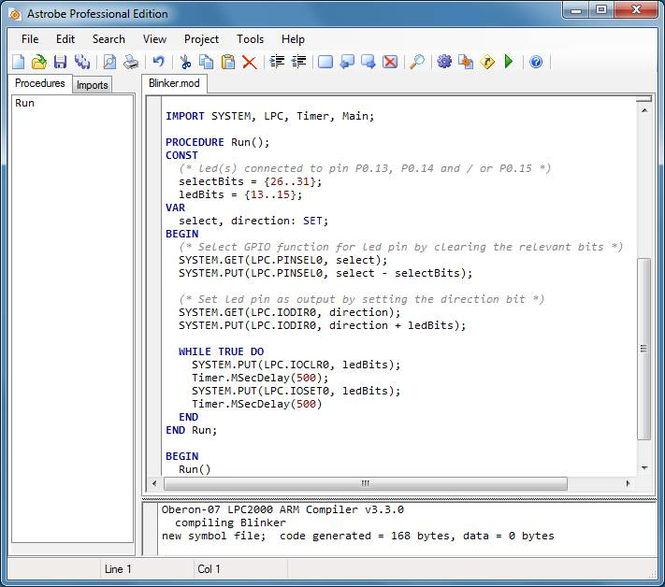 Astrobe is a fast and responsive integrated development environment for Windows. It is designed for developing reliable software to run on the powerful NXP / Philips LPC2000 family of ARM-based microcontrollers. The programming language supported by Astrobe is Oberon-07. The power of Oberon is such that the compiler, linker and runtime system are all written in the language. You can now write high- and low-level software without having to use assembler or C. Features include interrupt programming, register parameters, advanced data structures and floating-point operations.