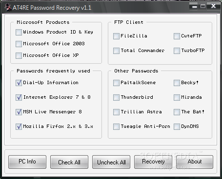AT4RE Password Recovery is a simple software tool whose purpose is to aid you in recovering passkeys from FTP clients and multiple other apps, and displays basic information about your PC.