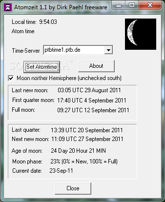 The application offers a bit more info than just simple time synchronization. As such, you find last new moon, first quarter, and full moon time values, as well as last quarter, next new moon, age, phase, and current date.
