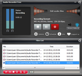 Audio Recorder Free is useful real-time audio recording software that lets you record any sound from your computer such as microphone, line-in audio, streaming audio from online radio station, audio played by media players, DVD audio directly into high quality MP3, WMA, OGG or WAV files. Furthermore, you can edit the recordings with the built-in audio editor and then share it - burn CDs, upload to the web, or export as MP3 for listening on your favorite portable players. Audio Recorder Free brings you a new way to enjoy music!