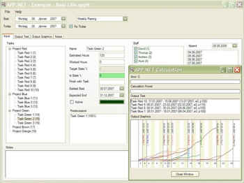 APP computes time plans, based on due dates, given estimations and other variables. A list of tasks and a list of employees can be defined. Tasks can be assigned to one or more employees. It is also possible to define a maximum percentage value an employee can/should work on a task. Predecessors, public holidays, leaves, weekly working hours and some more parameters can be specified and are considered in the calculation. Version 2.4 replaced the old binary file format. Additionally a complete code refactoring has been made.