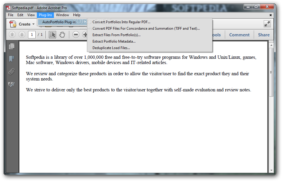 The plug-in provides powerful functionalities for managing PDF Portfolios: converting portfolios into regular PDF files (all files are combined into one), extracting embedded files including file attachments, converting non-PDF attachments into PDF format, exporting metadata into Excel-ready and HTML formats, converting portfolios for use in litigation support systems such as Concordance and Summation, and deduplication of load files and PDF Portfolios.
